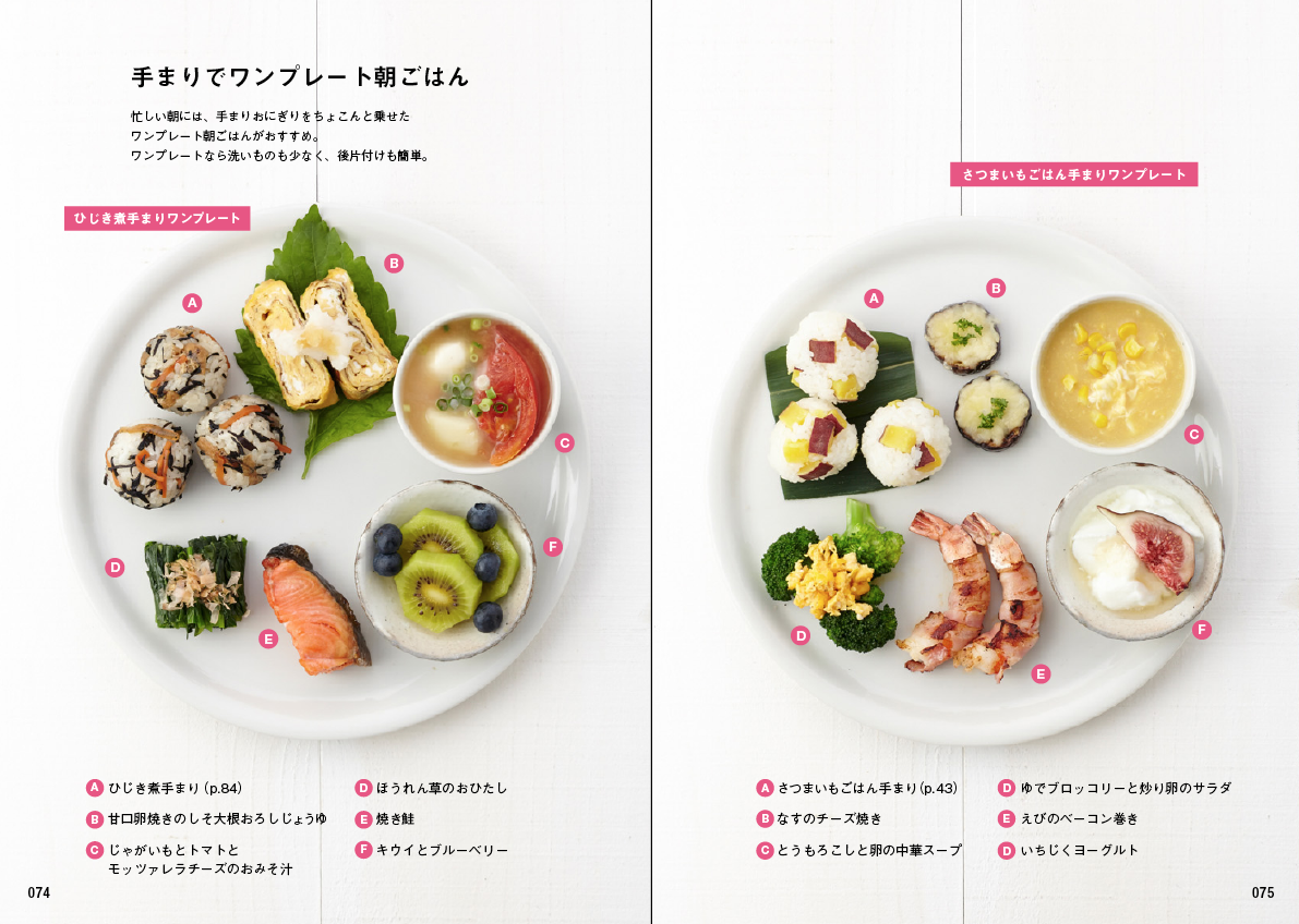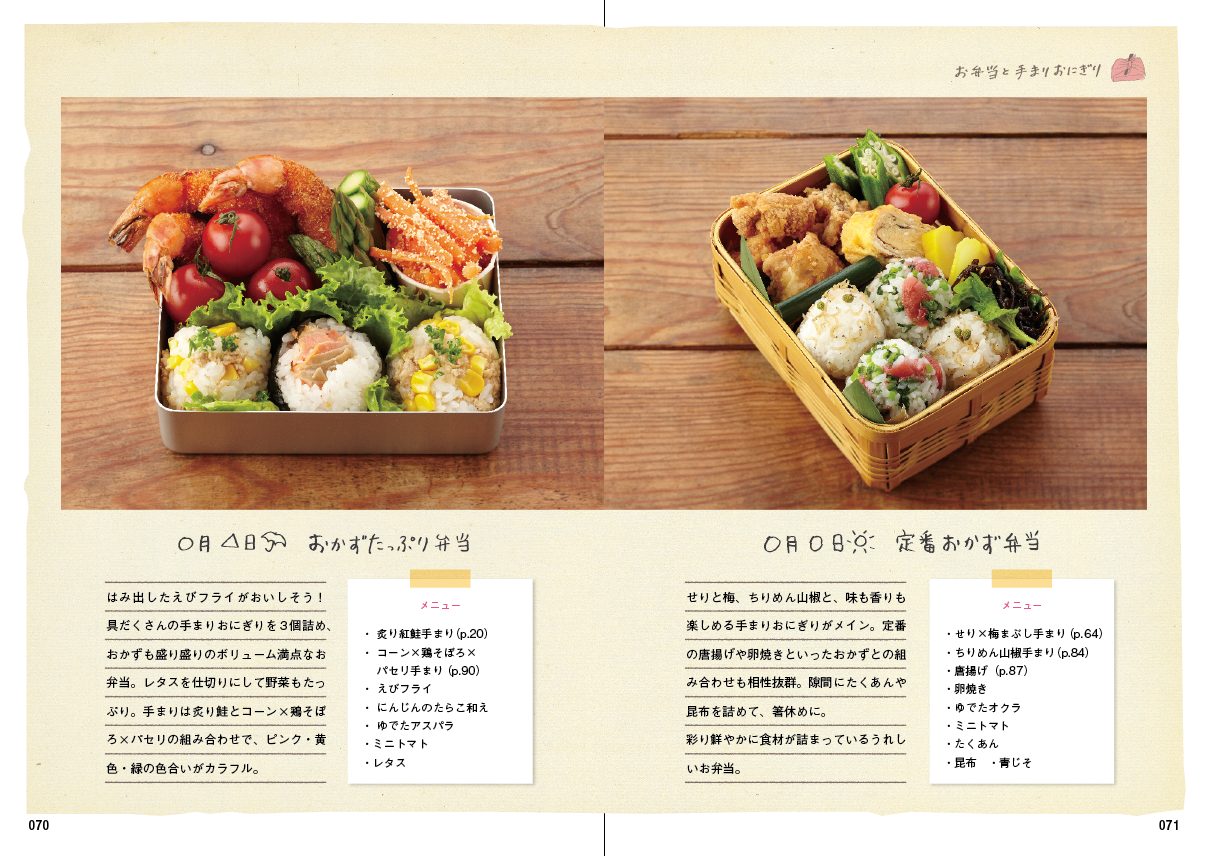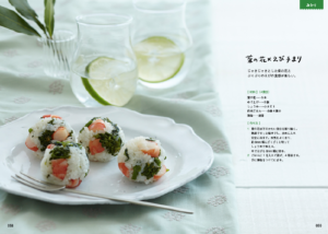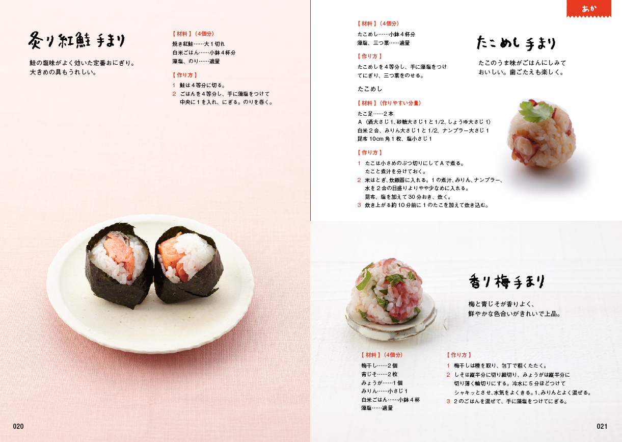 料理家・平岡淳子さんのおにぎりのアレンジを100種類掲載したレシピ本。おにぎりの形はすべてまん丸。単調にならないよう、キリヌキと角版写真がリズム良く並ぶように構成を考えてラフを描き、すべての撮影に立ち会った。